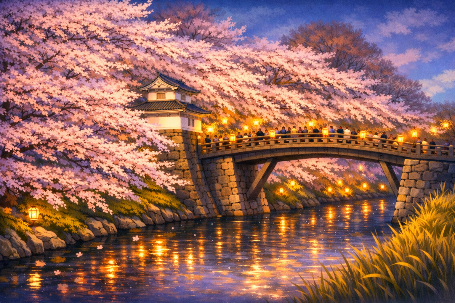 お堀の水面に映るピンクの光が、まるで絵画のような美しさで、私も毎年心を奪われます。