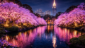 ライトアップ期間中は、ソメイヨシノやしだれ桜、山桜を含めた約450本もの桜が夜空を背景に輝き、訪れる人々を魅了します。
