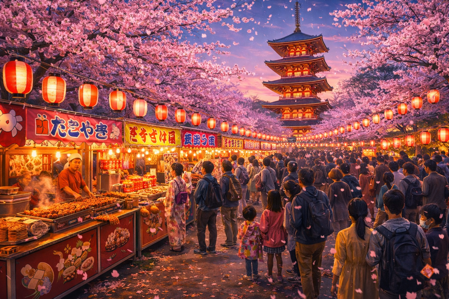 美しい桜や夜桜ライトアップ、魅力的な屋台グルメを存分に堪能してください。